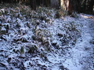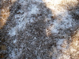 | シモバシラを見に行きましたが、城山から景信山、陣馬山にかけては前日に降った雪が少しあって雪に紛れてしまったためでしょうか見ることはできませんでした。雪がほとんどなかった高尾山から城山付近にかけては午前中に歩いたときには霜柱がのびていてサクサクと踏みながら気持ち良く歩けましたが、午後に戻るときにはすっかり融けて道はひどいぬかるみになっていて難渋しました。 |