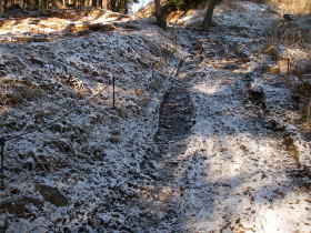| 帰路の城山から高尾山に向かう道は霜柱がすっかり融けどろどろ。滑ってとても歩きにくい。 |