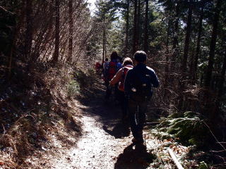 | 帰路の景信山から小仏峠への下り。雪が融けてぬかるみの斜面になっていて滑らないように慎重に下るため交通渋滞が起きていた。 |