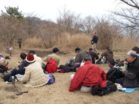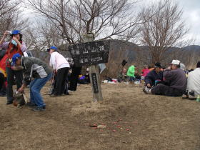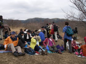 | 幕山山頂。3年前の同じような時期に来たときより、天気が悪く寒いせいか人はだいぶ少ない。我々15名はまとまって座ることができ、昼食をとった。 |