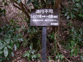 | 一の瀬橋から林道をしとどの窟に向かうと、2人連れのハイカーが来て、しとどの窟に向かう道は崩落のため通行できないと書いてあるので戻ってきたとのこと。幕山公園に戻るのは簡単なので崩落現場を見てみようとそのまま進む。林道から登山道に入るところにこの注意書きがあった。 |
