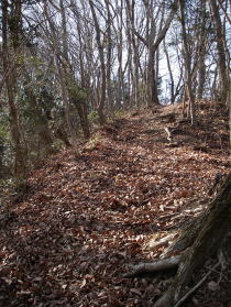 | 元郷の登山口から稜線に出るまでの道は、急なところでは土留めとステップを兼ねるように埋められた丸太はだいぶ朽ちているが道は当初の形をとどめ、全体が深い樹林帯にあるため下草ののびも遅いらしく、長い間手入れをしなくてもあまり変わらないような、しっとりとした落ち着いた感じがとても良かった。 |