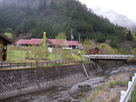 | びりゅう館。近くの山にはガスがまつわりついており、曇天。 |