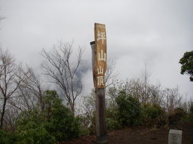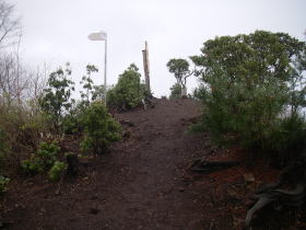| 坪山。ガスはまだ晴れない。到着が早いせいか、山頂を独り占め。西ルートを下り、東ルートを登りもう一度山頂に来るつもりなので、晴れてから楽しもうと早々に下山。 |