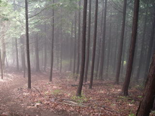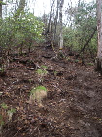 | 天気予報は晴れにもかかわらず、坪山付近はガスが晴れず、その上前日に降った雨の影響で木にはたっぷり水滴が付いていて、滑りやすい急坂で木を頼りにすると揺れて雨のように水滴が落ちてくる状態でした。直ぐにガスは晴れると思っていたのであまり写真を撮りませんでしたが、そのまま終わってしまいました。 |