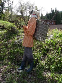 | なるべく時間をかけるように坪山に2回登るようなルートを歩いたが、それでもガスは晴れなかった。それに時期が遅く、ヒカゲツツジやイワウチワの花の見頃が過ぎてしまっていたのが残念。 下山後、時間があったので付近を少し歩いてみた。車で通るとただ見るだけで過ぎてしまうなかなかリアルな案山子の写真を撮った。 |
