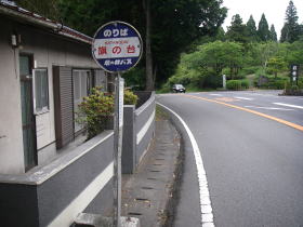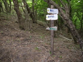 | 旗の台登山口。まずロープウェイ駅に行きましたが、8:45まで駐車場は閉鎖されていて入れないので、旗の台登山口から登りました。道路の脇には登山口の道標がなく、駐車スペースもないので登山口を見つけるのがたいへんでした。 コースには一気登山道と書かれていて、駆け足で登るようなネーミングです。道の手入れもよく、道標もたくさんあり、山岳レースでもやるのでしょうか。 |