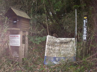| 一気登山道の道標と登山計画書入れ |