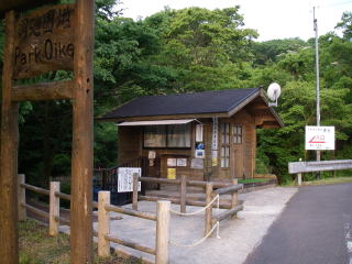 | 男池登山口の男池清掃員詰所。入山する人や男池園地を見る人から清掃協力金を徴収する。早朝のため無人だったが貯金箱のようなものに料金を入れて出発。 |