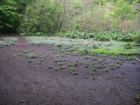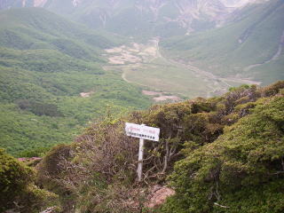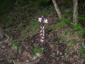 | ソババッケ。火山灰が水流で集まってできたような広い平坦地になっている。平坦地のはずれに平治岳への分岐を示す道標があった。 |