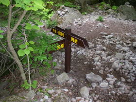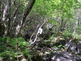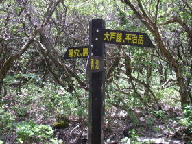 | 高塚山への分岐を示す道標。近くに風穴と書いてあったが、2.5万図の風穴の位置とは200m程違っているようだ。ここで大戸越へ行く道を探したが道らしいものはなかった。 |