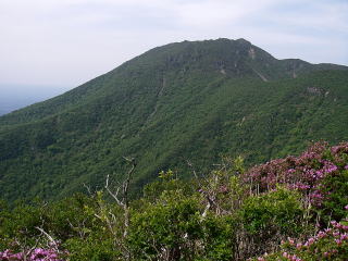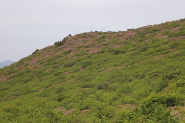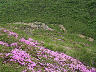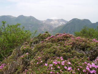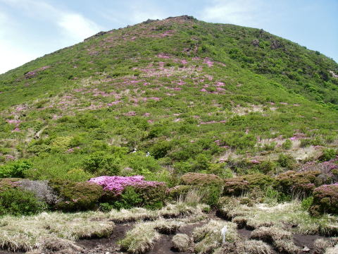 | 男池登山口の駐車場から周囲の山を見上げると深い樹林の覆われ、長者原や牧ノ戸峠から見る風景とはだいぶ違います。火山活動の跡を色濃く残す久住山周辺からは離れているので、樹林の歴史が長いようです。高塚山への登山道も深い樹林の道です。ところが標高のあまり違わない平治岳は大戸越付近からは灌木帯になり、ミヤマキリシマがたくさん咲いていました。 |