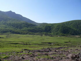 | 長者原を発つときに遊歩道から見る久住山方向の景観。晴れ間が広がり好天の気配。 |
