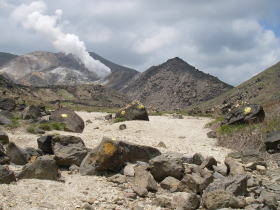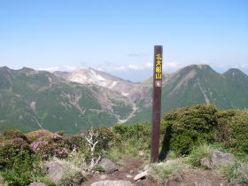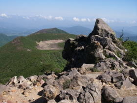 | 大船山の山頂付近から見る久住山(左)と三俣山(右) |