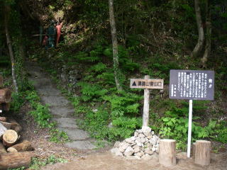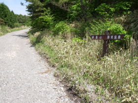 | 更に進むと林道があり『涌蓋山石ノ塔駐車場』書いてあった。轍はなく、車が来ているようすはなかった。 |