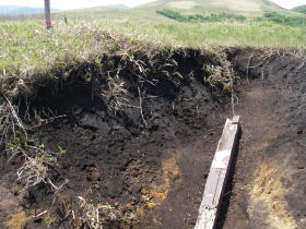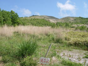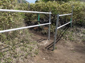 | 涌蓋越の下の分岐のこの柵から牧草地に入るが、道標がなくどう進めばいいのか迷う。しかしみそこぶし山は目の前に見え、牧草地なのでどこでも歩けそうなので、この段差の部分から草地に上がる。踏み跡があり、涌蓋山への道標も現れたので間違ったルートではなかったようだ。 |