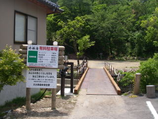 | 疥癬湯の有料駐車場。狭くて頼りなさげな橋の向こうが駐車場。渡れますかと聞いたら、橋の手前に駐まるようにいわれた。 |
