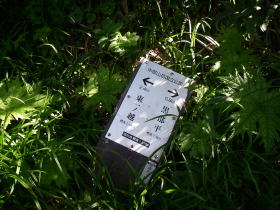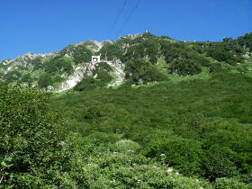 | 朝にもかかわらず強い陽射しで、黒部平で日焼け止めを塗るなどの身支度をする。山道の道標はなかったが、目の前に見える立山の方に向かうはずなので、黒部平高山植物観察園の案内に従って歩き出す。一歩踏み出せば扇沢からのトロリーバスやケーブルカーの混雑が嘘のように、私一人だけ。 |