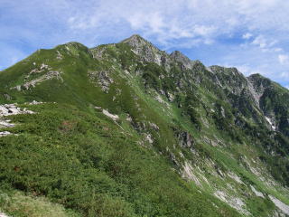 | 東一ノ越から見る右から龍王岳、鬼岳、獅子岳。これからあの稜線を歩くと思うと心浮き浮き。 |