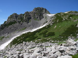 | 一ノ越に近づいて龍王岳を見上げると全く違う山のように見える。 |