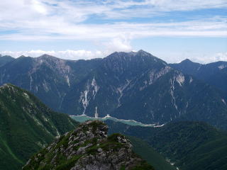 | 獅子岳から見る黒部湖と針ノ木岳から爺ヶ岳。右端のとがった山は北葛岳。 |