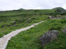 | 獅子岳に向かう登山道からの景観。この辺りにも花がたくさんあった。 |