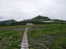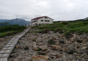 | 木道が現れ五色ヶ原に到着。やがて五色ヶ原山荘が見えてくる。 |