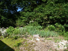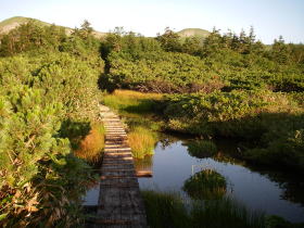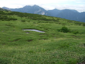 | 山荘から20分ほど歩いたところにある池塘。この辺りが五色ヶ原の端のようだ。 |