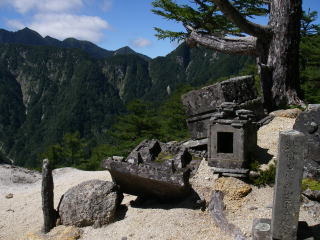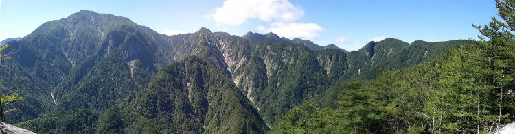 | 展望台から見る甲斐駒ヶ岳(左)、鋸岳。甲斐駒ヶ岳の左には鳳凰三山が見え、そのはるか後には富士山が見えました。 |