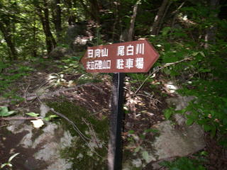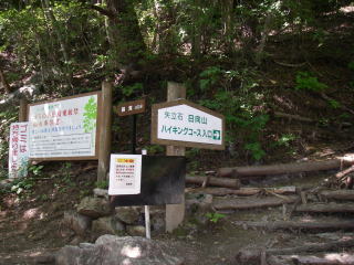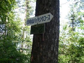 | 日向山登山道入口。前日雨の中この道標に気付き、林道の左手から山道に入るので地図とは違うと思いながら、登山口のようすが分からないのでここに車を止めました。 |