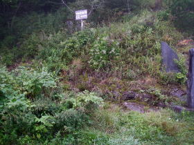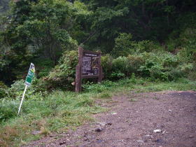 | 馬越峠の登山口の道標と駐車スペース。広さは3台ほど。ちょっと離れたところにも3,4台止まれそうなスペースがある。 |