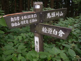 | 白倉への分岐の道標。白倉への道は地形が急なところはジグザグになっているので急勾配のところや大きな段差はなく歩きやすい。 |