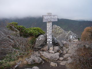 | 後烏帽子岳。蔵王方面の山には雲がかかり展望なし。風が強く寒いので早々に退散。 |