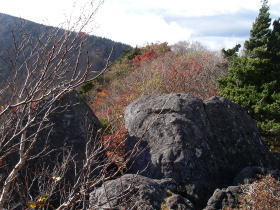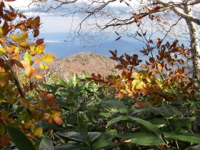 | 前烏帽子岳に向かう途中の樹林の切れ目から見えた前烏帽子岳に至る尾根の紅葉 |