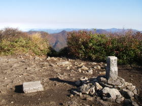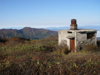 | 小屋のようなものがあるところはカケスガ峰の山頂で、山名の表示板には東北電力マイクロ波無線反射板跡と書いてあったので、小屋のようなものはその付属施設だったのかも知れない |
