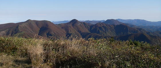 | カケスガ峰からの眺望。前日に歩いた山形神室、神室岳が左端から中央にかけて見え、その右には大東岳、その背後は船形山か。南には前山、雁戸山が見えたが太陽が山のうしろにありシルエット気味だった。 |