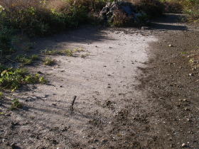 | 関沢への分岐を過ぎてしばらく進むと道標のない分岐があり、そのちょっと先に小さな小屋のようなものが見えたので行くことにする。 分岐からちょっと進むと小さな広場のようなところがあり、うっすらと霜で覆われていた。 |