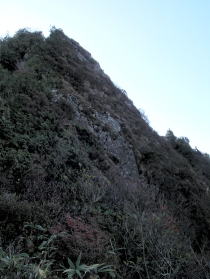 | 雁戸山に近づくと痩せ尾根になり、岩壁になっているところも見えるが、逆光で写真では分かりづらい。 |