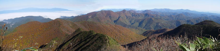 | 雁戸山からの眺望。前日に歩いた笹谷峠から神室岳に至る尾根、本日歩いた雁戸山に至る尾根をはじめ、大東岳、船形山、泉ヶ岳などを見ることができた。左手上方の雲海の下は山形市。 |