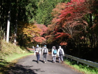 | 日差しを浴びて輝く紅葉を愛でながら上養沢バス停から登山口に向かう |