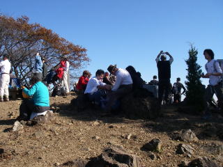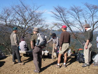 | 日の出山。多くの人がいて私たちの昼食の場所を確保するのに苦労するほどでした。各自の用意した昼食の他に、お湯を沸かしてミニカップラーメンとコーヒーを味わいました。山頂だとひと味違う感じがします。 |