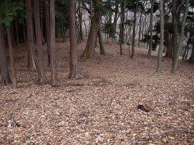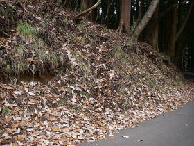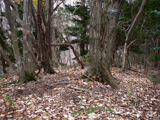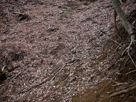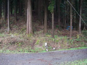 | 最後は密生した人工林の薄暗くて急な斜面を下って車道に出ました。赤布があるだけでこの登り口に気づくのは難しそうです。 |
