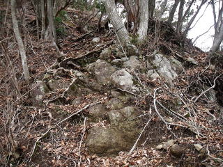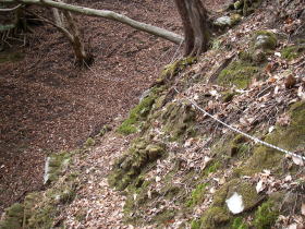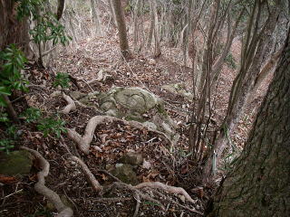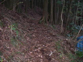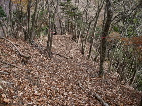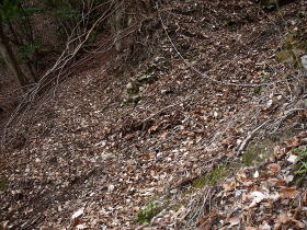 | P616付近からなはっきりとした道があり、道は稜線を離れ尾根の斜面をトラバースするように三峰山の縦走路につながっている。道が崩れているところにはトラロープが張ってあった。 |