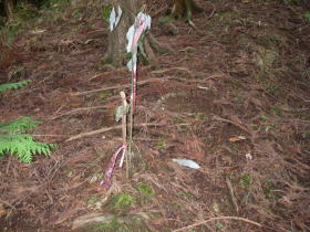 | 長短2本の棒を立てた赤布。枝打ちの時のものか。 |