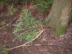 | 最近枝打ちをやったらしく、青々とした枝がたくさん落ちていた。 |