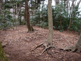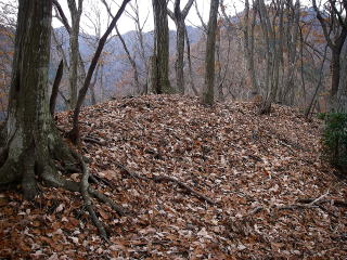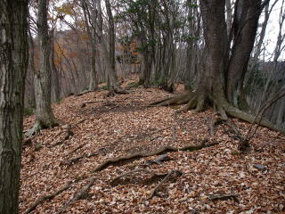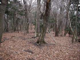 | P415が近づくとなだらかな尾根になる。下草はなく、落ち葉におおわれ歩きやすい。 |