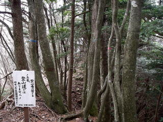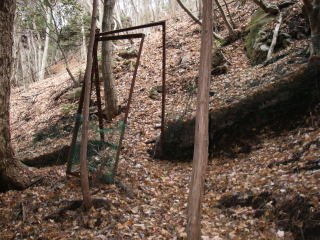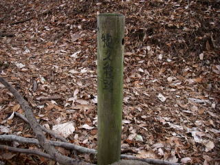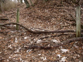 | 三峰山縦走路出合には2本の柱が立っていて、綱が張ってあったようだが、倒木をおいて誤って入り込む人がいないようにしてあった。柱には惣久経路と書かれ、歩いた道の名前らしい。 |