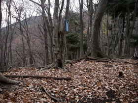 | 縦走路に戻り、ほんの少し三峰山の方に戻ると赤布があり、ここから下る尾根がP777につながっていることは間違ってくだったときに確認出来ていたので下りました。急なところにはトラロープがあり楽な気持ちで下ることができました。 |
