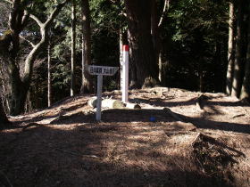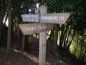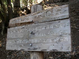 | 日向薬師の裏手のこの道標の脇の鎖で閉ざされている道を道標に逆らって日向山に向かう。 |