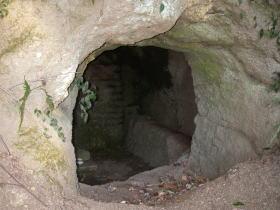| 山頂に近づくと日向薬師奥の院と書かれたガイド板と洞窟の祠があった。以前は虚空蔵菩薩が祀られていたが今は参詣の便宜のため本堂の近くに移されていると説明がある。 |